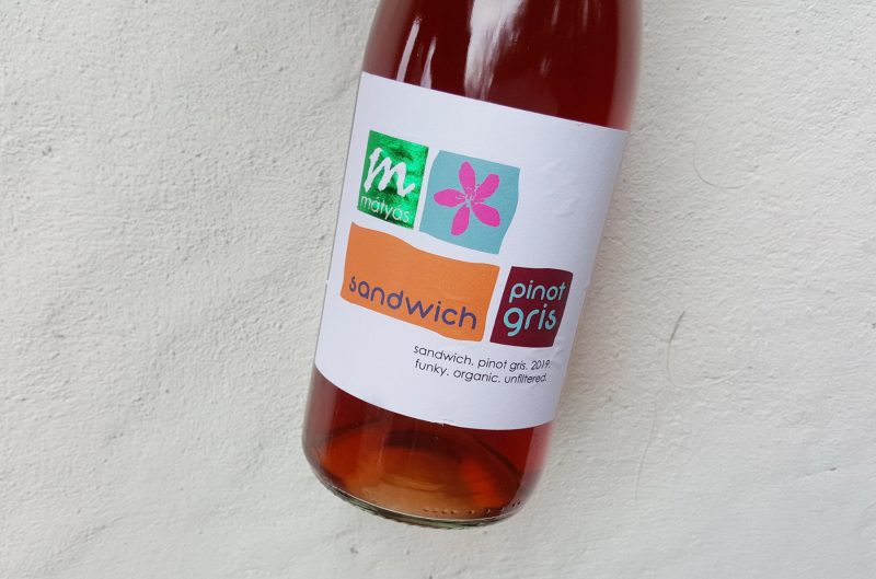 Bohater tego tekstu – Mátyás Sandwich Pinot gris 2019 – to niefiltrowana pomarańczka z białych gron, a zarazem… wino różowe. W barwie faktycznie przypomina sok z rabarbaru tudzież czerwoną herbatę. Przydomek z etykiety „sandwich” oznacza, że podczas fermentacji partia pełnych kiści winogron z szypułkami trafiła między dwie „kanapki” złożone z pokruszonych gron. W efekcie powstało to mniamnuśne funky wino. W zapachu mamy sporo mandarynki, malinę, nutę czerwonej herbaty. Usta są pięknie zrównoważone, pokazują z jednej strony łagodną, nieco gorzkawą taninę, z drugiej zaś cieszą energetyczną kwasowością.