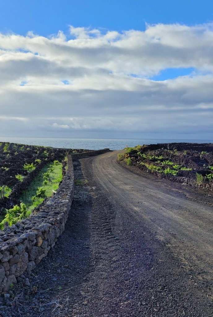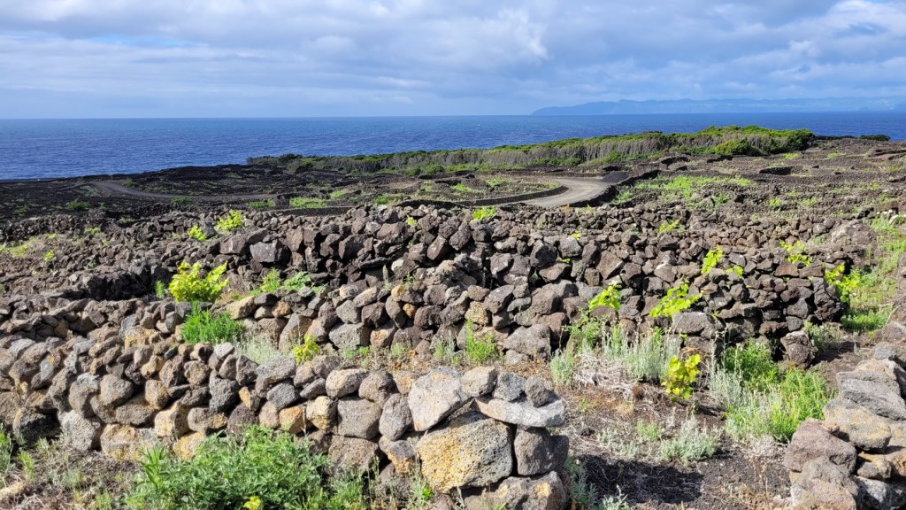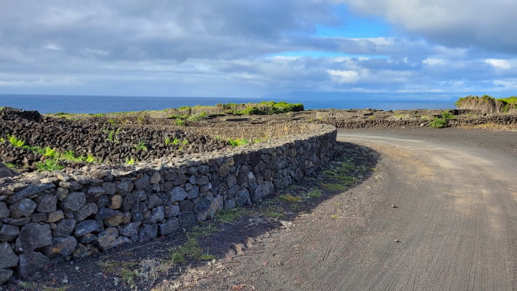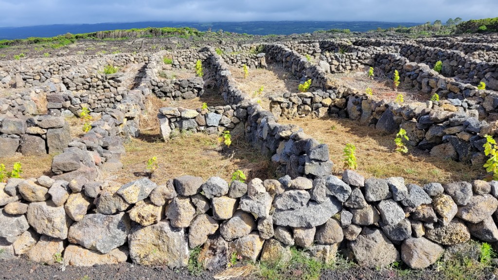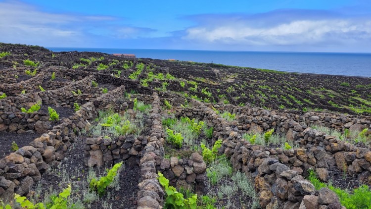 Do winiarni zjeżdża się z głównej drogi prowadzącej z lotniska do stołecznego miasteczka Madalena. Wijąca się jak wąż droga wykuta jest wśród zalegającej zastygłej magmy. Wszędzie widoczne są tradycyjne bazaltowe parcelki currais, zbudowanie starannie w całości ludzką ręką ponad 500 lat temu. To sposób prowadzenia winorośli w postaci zbliżonych wielkością kwadratowych komórek o ścianach-murkach z bazaltowych kamieni. Konstrukcje te spełniają trzy funkcje: chronią przed chimerycznym, silnym wiatrem znad Oceanu Atlantyckiego, przed zasoleniem, które jest „rozpylane”, gdy o brzeg rozbijają się fale, a także kumulują ciepło. W jednym curral znajduje się z reguły od jednej do sześciu roślin. Kilka komórek tworzy zespół o nazwie canada, a wiele canadas składa się na całą parcelę. Te niezliczone komórki ciągną się nierzadko aż po horyzont i zlokalizowane są często już kilkanaście metrów od brzegu oceanu. Spoglądając na ten pofałdowany czarny krajobraz mam wrażenie jakbym wylądował na innej planecie lub jakbyśmy oglądali wykwit nieznanej cywilizacji, która podniosła się z kolan po wybuchu złowieszczego wulkanu.