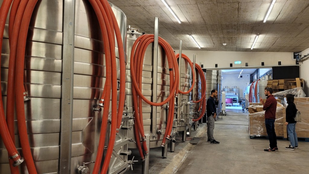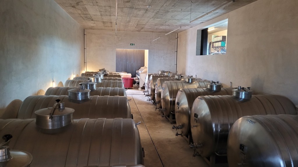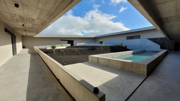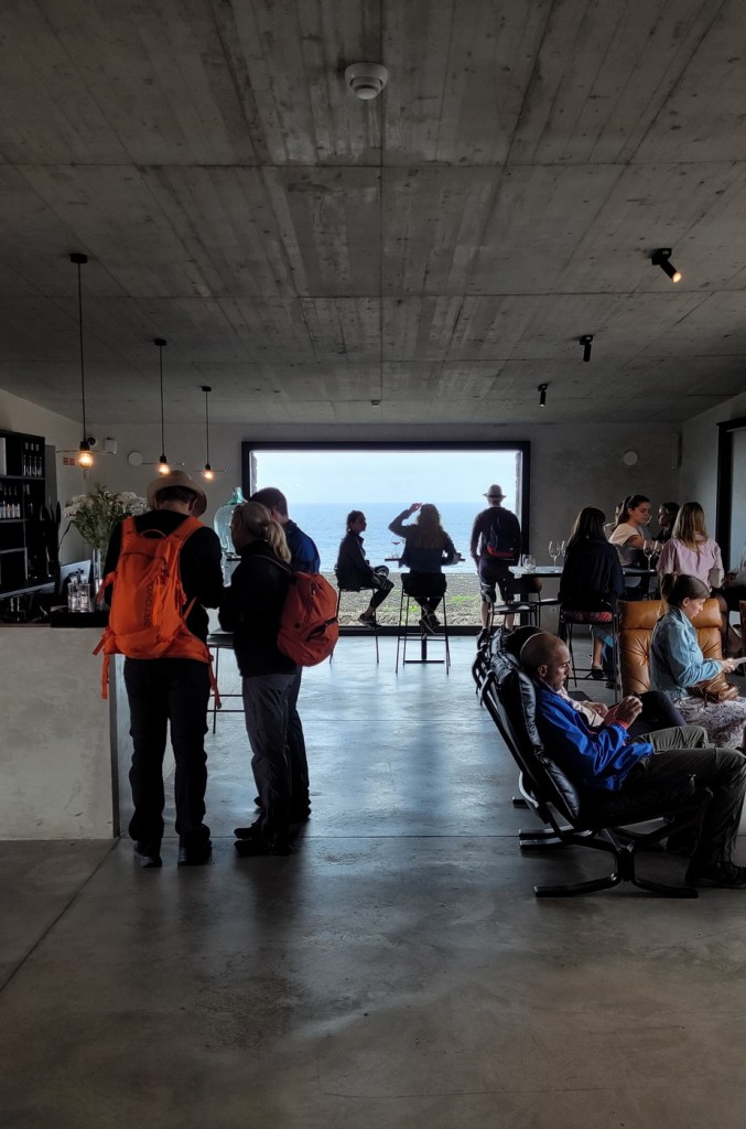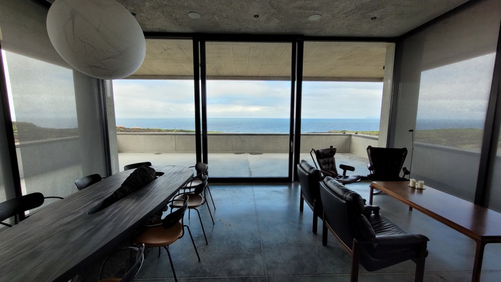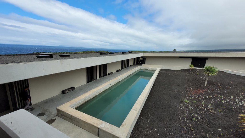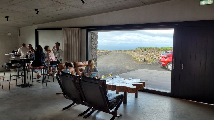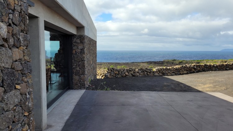 Wizualnym break pointem dla otoczenia jest nowoczesna bryła winiarni. Stworzona w hołdzie dla wina z Azorów przez lokalną firmę architektoniczną z Pico. Budynek zwrócony „twarzą” w stronę wulkanu, zbudowany został ze skał wulkanicznych, chroniących posiadłość przed morską bryzą i/lub ostrymi wiatrami. Pośrodku znajduje się kwadratowy dziedziniec z krużgankami, które zapewniają dostęp do sal degustacyjnych, restauracji, winnicy i sypialni (o czym niżej) o kształcie nawiązującym do starych zbiorników na wodę z winnic oraz naturalnie spadzistych dachów klasztorów na wyspie. W kompleksie znajduje się też sześć pięknych apartamentów na wynajem i fine diningowa restauracja, na którą zabrakło mi niestety czasu. Ascetyczne, betonowe wnętrza winiarni i sal degustacyjnych z ogromnymi (od sufitu po podłogę) szybami dopełniają wizualnego dzieła.