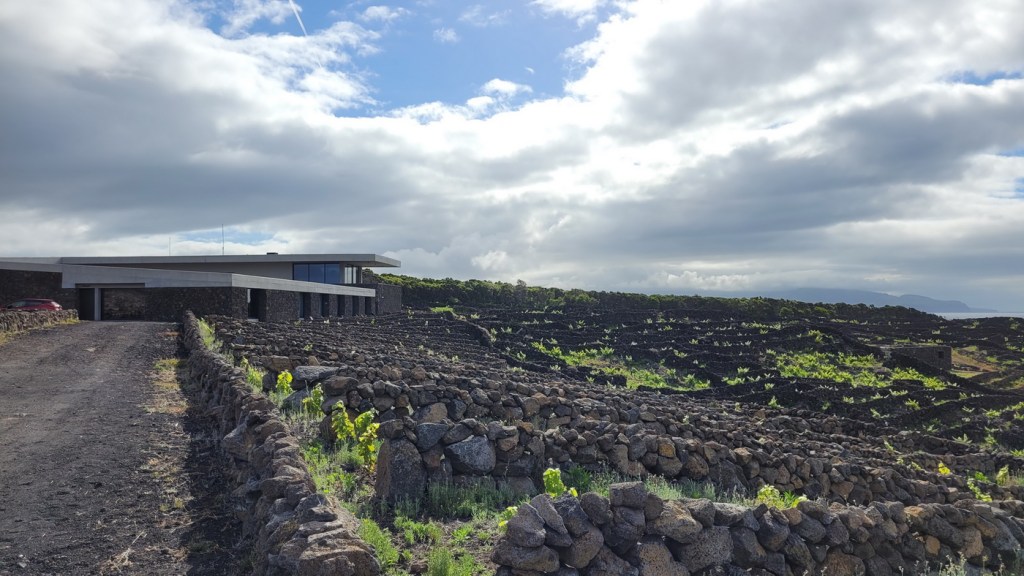 Czerwiec na Azorach jest ciepły i parny, temperatura nie przekracza co prawda 25 st. C, ale wilgotność powietrza daje się we znaki. Dla zimnolubnych wszechobecny jest wiatr, który nie opuszczał mnie na żadnej z trzech odwiedzonych wysp. Na Pico, podobnie jak wcześniej na São Miguel, doszedł do tego przelotny, drobny deszcz. Tak też było tego czerwcowego popołudnia, gdy zaplanowałem wizytę w Azores Wine Company. Przez tę aurę majestatyczny szczyt wulkanu Pico, który wznosi się nad nowoczesną bryłą winiarni, spowity był we mgle. Jakby ktoś równo nożem odciął górę stożka.