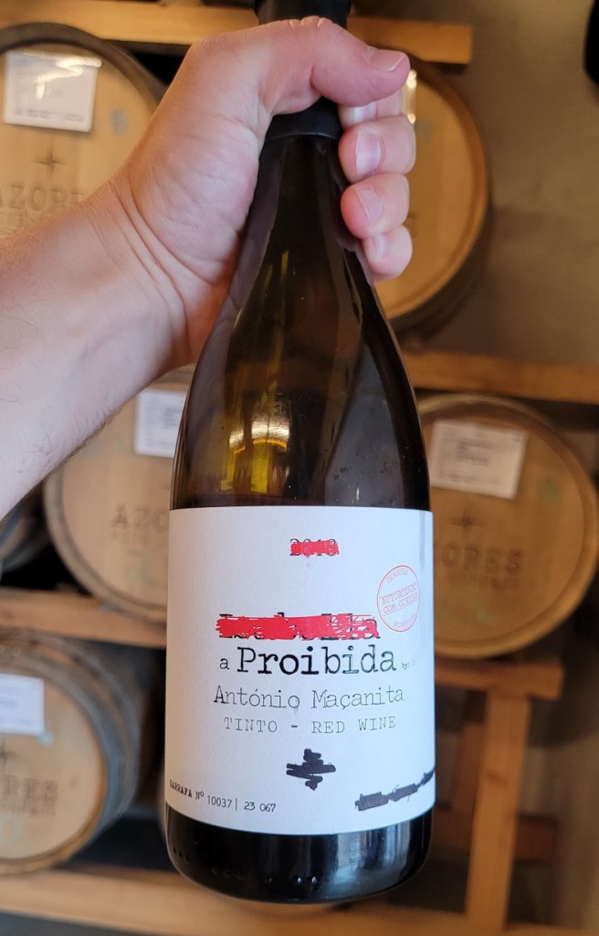 Ostatnia z propozycji to czystej krwi dziwadło. Do teraz zastanawiam się, czy w pozytywnym tego słowa znaczeniu, czy nie, ale… chyba jednak tak. Już sama historia wina A Proibida (z port. zakazane) jest ciekawa, a nawiązanie do prohibicji nieprzypadkowe. Powstało z tradycyjnego dla Pico szczepu Isabella, z którego rolnicy na wyspie często robili/ robią wino domowe. Oficjalna sprzedaż wina w UE została zakazana, ponieważ coś się urzędnikom z Brukseli nie zgadza w genezie ampelograficznej odmiany. Azores Wine Company nie dało za wygraną i wino z Isabelli nadal pichci, choć okrasiło je wymowną, buntowniczą etykietą z zamazanymi „wrażliwymi danymi” produktu, do których mogli by się przyczepić smutni panowie w czarnych garniturach. Jeśli więc chcecie spróbować Isabelli – musicie odwiedzić Pico. Co zresztą nie jest znowu najgorszym pomysłem… Wróćmy jednak do wina. Bukiet to przedziwna i zadziwiająca mieszanka prażonych kuchennych ziół, gałki muszkatołowej, cykorii, ciemnych kwiatów, dymu, krwi (sic!) oraz na dalszym planie truskawki, maliny i żurawiny. A to i tak zaledwie zalążek tego, co tu można wyniuchać. Prawdziwy krejzol. Ba, spodziewam się, że przynajmniej 60% testujących stwierdziłoby, że to wino po prostu śmierdzi. Usta leciutkie, jak najbardziej lekka kadarka, którą próbowaliście cię w życiu. Oryginał startujący we własnej kategorii i lidze, takie wino z cyklu „love or hate”. U mnie spotkało się z tym cieplejszym uczuciem. Ocena: ***** (dobre i niezwykle interesujące – 4.5/6).