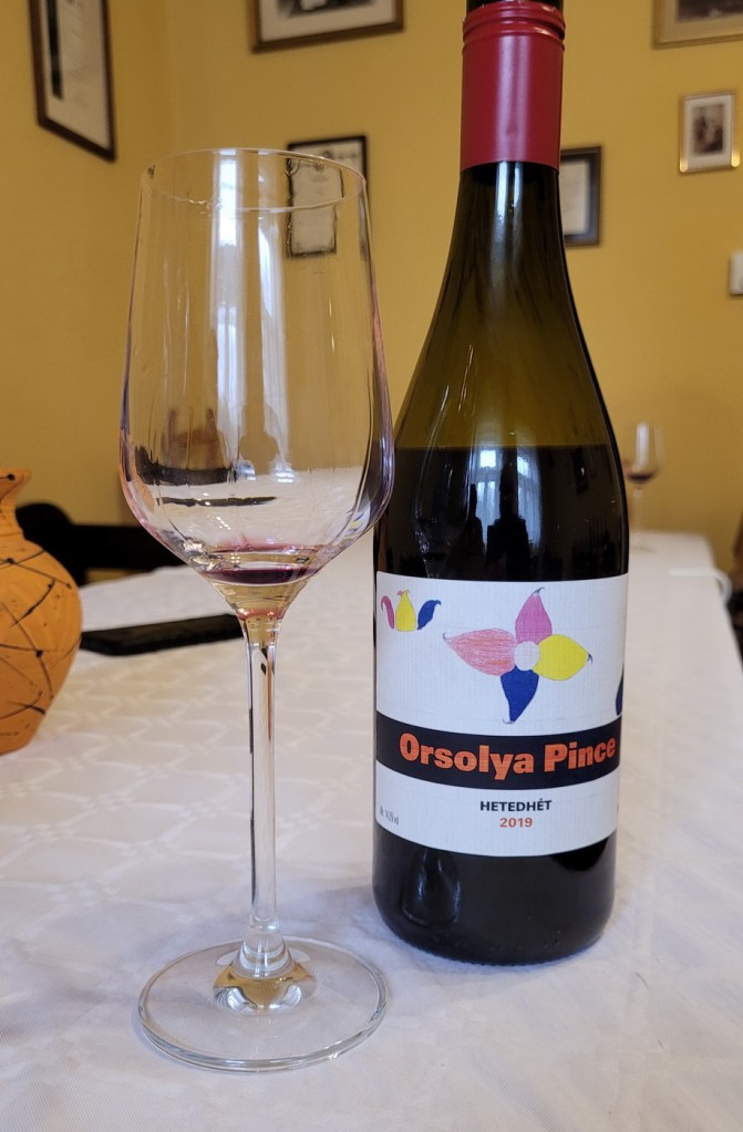 Orsolya Pince Hetedhét 2019. Blend syrah (60%) i kadarki (40%). Nos z aromatami wiśni, czerwonej porzeczki, soku pomidorowego, goździków, białego pieprzu, nut ziemistych. Średnie ciało, krągła tanina, w smaku intensywne w kierunku suszonych owoców i wiśni, nieco męczy swoją beczkowością. Ocena: **** (dobre – 4/6).