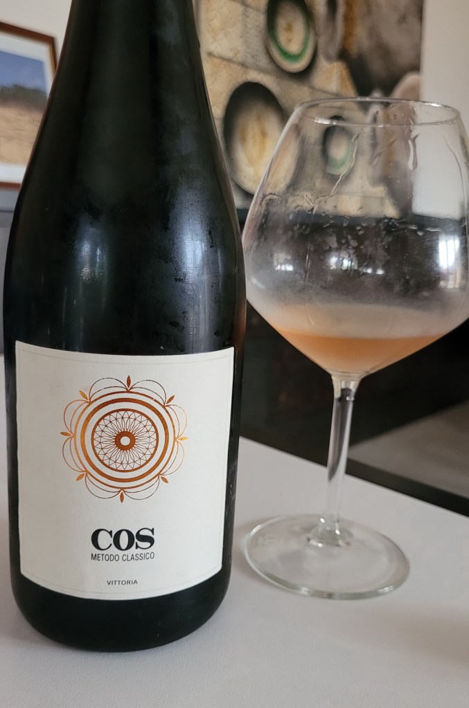 COS Metodo Classico NV to nowość (a przynajmniej dla mnie) w ofercie producenta. Musiak robiony metodą tradycyjną w 100% z czerwonej odmiany frappato. Zero dosage. Owoce z pierwszego tłoczenia fermentowane są w amforze, a następnie dojrzewają w cemencie do następnego zbioru. Wino jest następnie butelkowane z dodatkiem świeżego moszczu z kolejnego rocznika. 18 miesięcy na osadzie drożdżowym, bez dodatku SO2. Brzoskwiniowe oko. Powabny musiak z delikatnym perlage, nutami liofilizowanych truskawek i rabarbaru. Zdecydowane w posmaku, zwiewnie owocowe, z wyraźnym rysem wytrawności i hardą kwasowością. Molto bene. Ocena: ***** (bardzo dobre – 5/6).