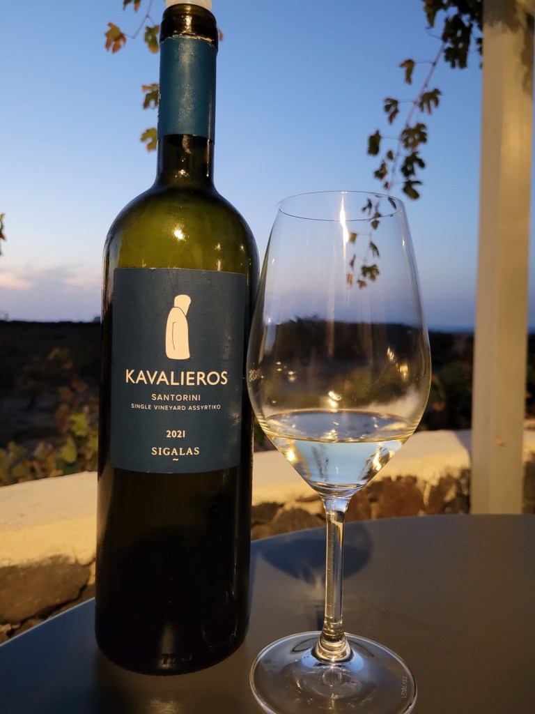 Sigalas Kavalieros Assyrtiko 2021 przygotowano z gron starych krzewów rosnących na parceli w Imerovigli, nazwanej Kavalieros przez jej dawnego właściciela Parisa Sigalasa. Wino fermentowało i dojrzewało przez 18 miesięcy na osadzie w stalowych zbiornikach. Ponownie mamy tu jasnożółty kolor z subtelnymi zielonkawymi odcieniami. W nosie dojrzałe cytrusy, marmolada cytrynowa, białe kwiaty, nuty ziołowe spod znaku rozmarynu, morska bryza. Szczodre, bardziej kremowe usta, z typową kwasowością i mineralnością oraz długim, ciągnącym się finiszem.  Eleganckie, wielowymiarowe, acz wciąż zbyt młode. Ocena: ***** (bardzo dobre – 5/6).