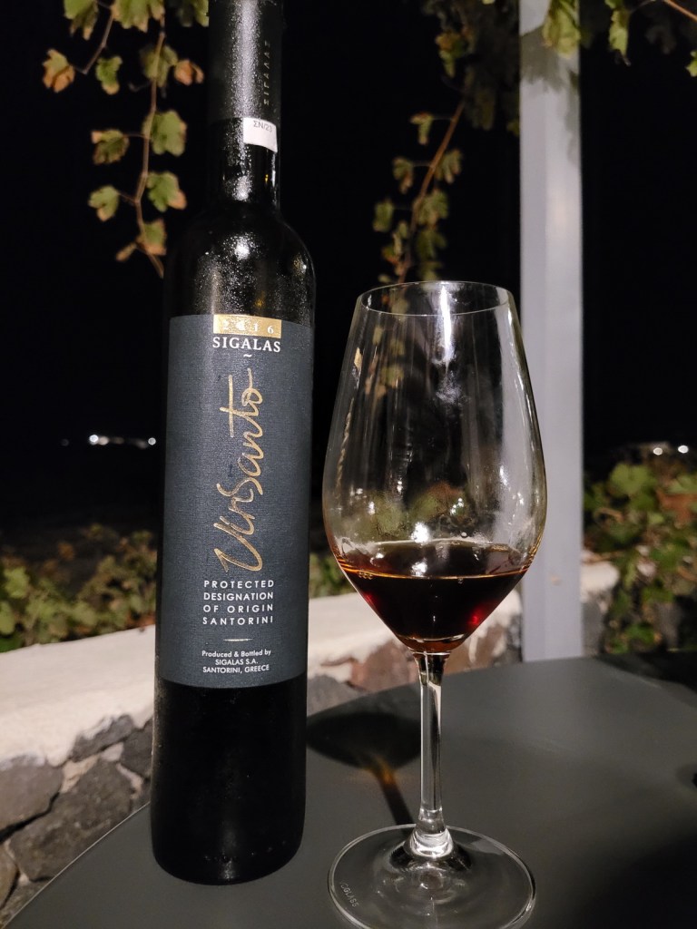 Kończące wieczór Sigalas Vinsanto 2016 to kupaż assyrtiko (75%) i aidani (25%). Grona na wino były suszone przez 10-12 dni na słońcu. Po tłoczeniu, wino trafiło do dębowych beczek na okres 6 lat. W kolorze ciemna, bursztynowa barwa. Nos o pięknej złożoności i pikantnym charakterze. Znajdziemy tu aromaty suszonych owoców, prażonych orzechów, ziaren kawy, miodu i gorzkiej czekolady. W ustach słodkie (blisko 300 g/l cukru resztkowego), nektarowo-miodowe, jedwabiste, ze słodko-kwaśnym miksem i dobrą równowagą. Elegancki i długotrwały posmak. Ocena: ***** (bardzo dobre – 5/6).