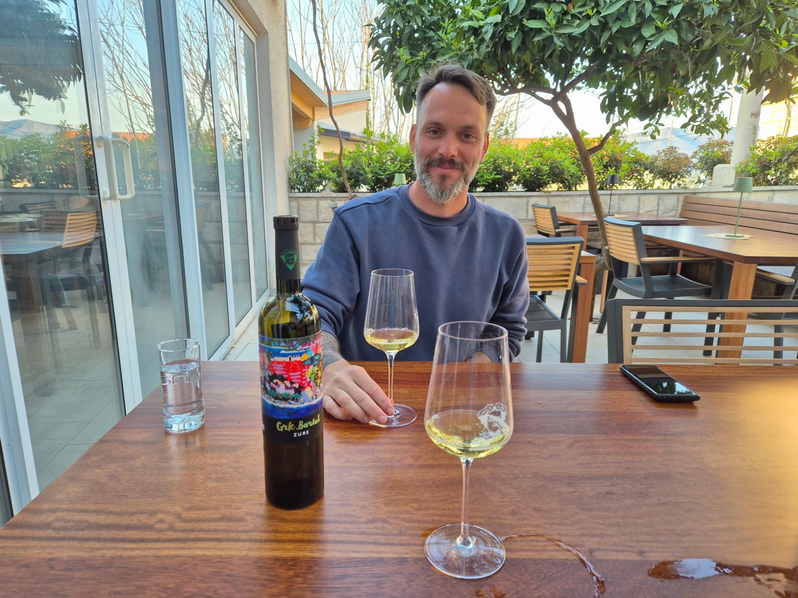 Podczas ponad trzygodzinnego spotkania z Ivanem przerobiliśmy temat wyjątkowości grka, sporego potencjału białego szczepu pošip, pogadaliśmy o Wiśle i o przemyśle. To był doprawdy świetny czas, który umiliły nam między innymi: świeżo zabutelkowany tego dnia, rocznik 2024 wina grk, jak i równie emocjonujący (jeszcze ze stalowego zbiornika) pošip.