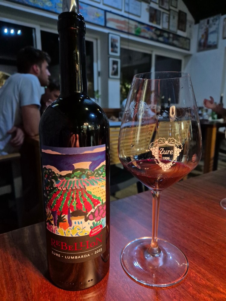 Na koniec tastingu dwie mocarne czerwienie. W Zure Rebellion 2023 połączono pięć odmian: cabernet sauvignon, merlot, syrah, plavac mali i alicante bouschet. Całość dojrzewała w dębowej beczce. W nosie odnajdziemy czarne jagody, jeżynę, nuty ziół i tytoniu. Usta potężne, choć krągłe, z charakterną taniną i głębią owocu. 16%, ale nie razi. Ciekawe. Ocena: **** (dobre – 4/6)