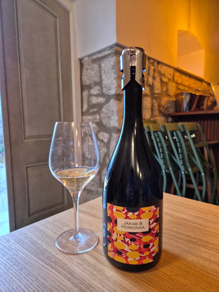 Na start weszło wspólne dzieło Jakaba i Attily Homonny – musujące Jakab Pezsgő Brut 2018. Mamy tu czystego furminta po pięciu (!!!) latach dojrzewania na osadzie. Wino, co ciekawe, przyrządzone metodą ancestrale (pét-nat), ale przefiltrowane. W nosie sporo żółtego jabłka, gruszka, skórka chleba. Usta mocno wytrawne, cytrynowo-jabłkowe, zaokrąglone drobnym cukrem resztkowym. Drobna perlistość i przyjemna piana. Ocena: ***** (dobre i niezwykle interesujące – 4.5/6).
