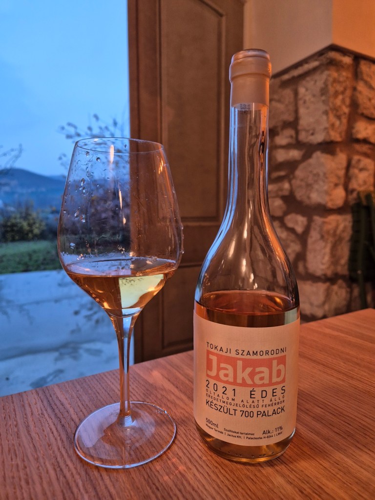 Ostatnim akcentem jest słodkie Jakab Edes Szamorodni 2021, choć co warto zaznaczyć o dużo niższej zawartości cukru resztkowego niż większość tokajskich win słodkich (100 g cukru przy 8 g kwasu). Owoce (70% furminta, 30 % hárslevelű) pochodzą z siedliska Rány.W nosie egzotycznie (ananas, mango), do tego suszona morela, dżem morelowy, rodzynki. W ustach żywy profil smakowy oparty na ananasie, mango i pikantnych akcentach ziołowych. Fajny balans, dużo dojrzałego owocu, zaskakująca wysoka kwasowość. Świetne szamorodni. Ocena: ***** (bardzo dobre – 5/6).