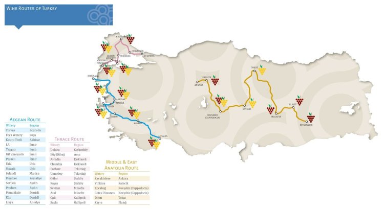 Najważniejszym regionem winiarskim pozostaje obszar Morza Egejskiego, odpowiedzialny za około 30 procent krajowej produkcji. Obejmuje on zarówno wyspy Bozcaada i Gökçeada, jak i nadmorskie lokalizacje – Urla, Selçuk, Bodrum czy Datça – oraz bardziej kontynentalne tereny w głębi lądu, m.in. Manisę, Denizli i Uşak. Drugim istotnym obszarem jest południowy wschód kraju, skąd pochodzą takie odmiany jak Öküzgözü i boğazkere (regiony Elazığ i Diyarbakır). Ważną rolę odgrywają również Tracja (Północna, Nadmorska i Półwysep Gallipoli) oraz Anatolia Centralna z Kalecik i Kapadocją.